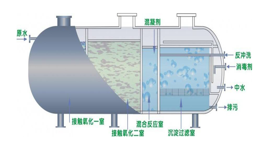 3.污水处理设备中的A/O生物处理工艺采用推流式生物接触氧化池,它的处理效果优于完全混合式或二、三级串联完全混合式生物接触氧化池。该生物氧化池比活性污泥池体积小,对水质适应性强,而且能耐冲击,性能好,出水水质也极其稳定。采用新型弹性立体材料,具有实际比表面积大,微生物挂膜、脱膜方便,而且对有机物去除率高,能提高空气中氧在水中的溶解度。