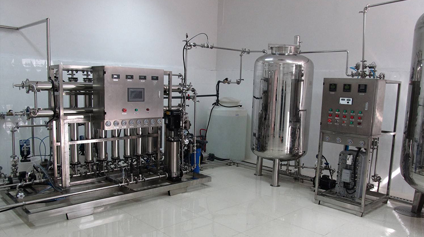 原水→石英砂过滤器→活性炭过滤器→软化水器→中间水箱→低压泵→精密过滤器→一级反渗透→第二级反渗透→无菌纯化水箱→纯化水增压泵→微孔过滤器→纯化水用水点