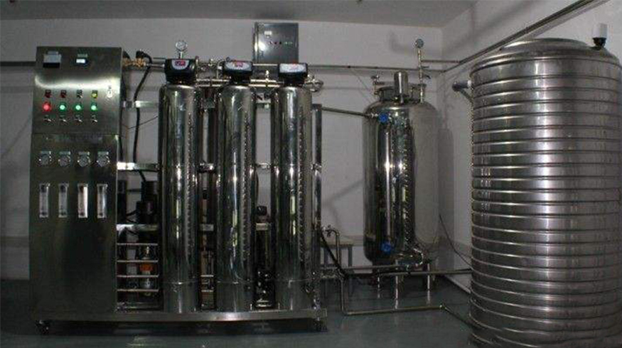 原水箱→原水增压泵→石英砂过滤器→活性炭过滤器→软化水器→精密过滤器→高压泵→RO反渗透主机→中间水箱→中间加压水泵→离子交换混床→纯化水箱→增压水泵→紫外线杀菌器→微孔过滤器→用水点