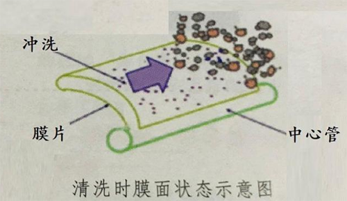 物理清洗是利用机械性的冲刷来去除膜元件的污染物,以恢复膜元件的性能,如可采用湍流、振动、水气混合、超声波等物理方法将吸附在膜元件上的污染物冲洗掉。如图所示: