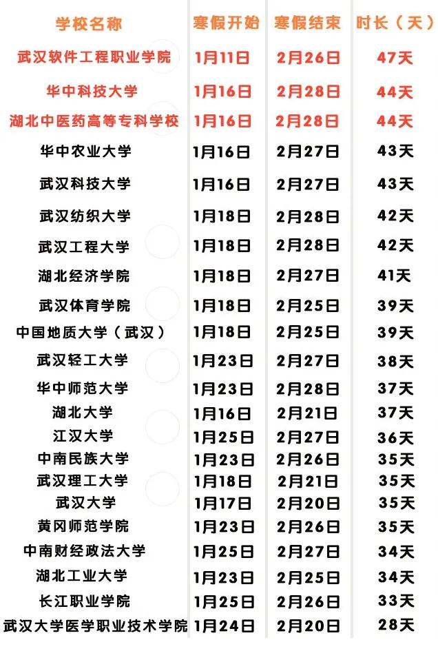 随着2020年即将过去,2021年即将到来,湖北省2021年的节假日安排已经出炉,公布了2021年元旦、春节、国庆等国家法定节假日的安排,同时伴随着湖北省2021年节假日的出炉,全省各地高校的寒假安排也进行了公布,最早开始放寒假的武汉软件工程职业学院,从1月11日开始就放寒假了,最迟的大学是长江职业技术学院,中南财经政法大学,需要到1月25日才开始放寒假。