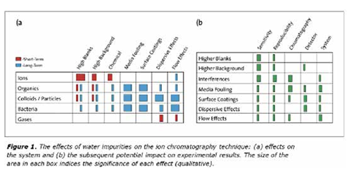水污染的影响可能会产生严重的后果,并有可能使实验结果无效。但是杂质对这种分析的可靠性和再现性究竟有什么影响呢?如图1所示,离子、有机物、胶体、细菌和气体的污染影响都会在一定程度上影响灵敏度和重现性。离子污染物往往具有显着但短期的影响,产生化学干扰,直接降低结果并降低灵敏度。离子污染物水平的波动也会导致观察结果的更大差异。