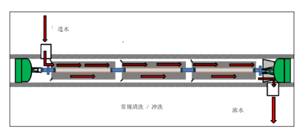 反渗透膜的正向清洗,是清洗液从压力容器进水端流入,经过膜元件后从压力容器浓水端流出,该流向与 RO 系统正常运行时一致,是常见且有效的清洗方式。
