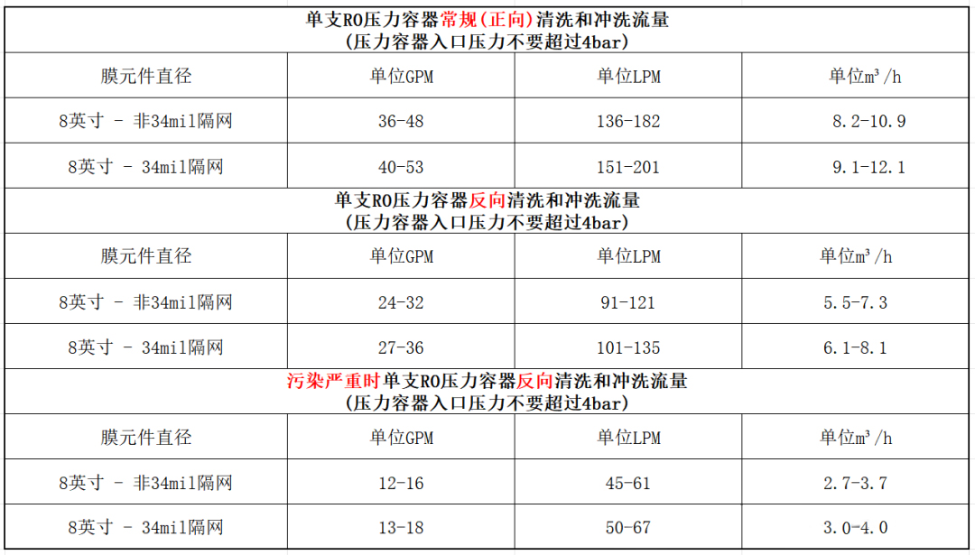 - 清洗流量限制设定:常规正向清洗时,末端反渗透膜元件有止推环支撑保护,不会受到挤压变形。但反向清洗时,首支膜没有止推环保护。以 8 英寸膜元件为例,常规清洗流量为 136 - 182L/min,反向清洗时建议将流量限制在常规清洗流量的 2/3,即 91 - 121L/min;若压差很高、污染严重,清洗流量要降至 1/3,即 45 - 61L/min,以此降低膜元件变形的可能性。对于采用 34mil 进水隔网的膜元件,清洗流量比传统膜元件稍大。清洗开始时应先采用较低流量,然后根据实际压差值缓慢提高,当污染物脱除且压差降低后,才能在常规流量下进行反向清洗。