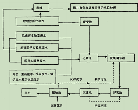 经实验室前端进行废水的分类处理,再根据废水废液的可回收性、危险性交付有资质的单位进行处理,余下的实验室废水可通过实验室前处理后经由排水管道进入化粪池,废水进入化粪池与生活污水进行混合后,进入厌氧调节池进行水解酸化处理,由于生活污水可以起到稀释降解有机物的作用,可以改善一些难降解性的有机物。