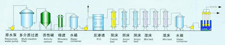 原水→原水箱→原水泵→多介质过滤器→活性碳过滤器→软化器→一级精密过滤器→一级反渗透→二级反渗透→臭氧发生器→纯化水箱→紫外杀菌器→纯水泵→用水点。