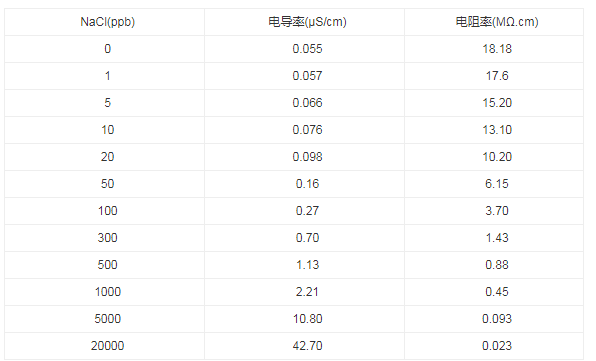 在25℃时,NaCl浓度与电导率/电阻率值的关系。