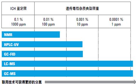 随着分析技术的不断进步和分析方法的不断优化,对于基因毒性杂质检测的灵敏度要求越来越高。以前,分析基因毒性杂质,将 HPLC (配有 UV/Vis 检测器)及 GC(配有 FID 检测器)作为常规分析方法。近年来,LC-MS和GC-MS等分析方法正在被越来越多的使用,检测限一般在ppb级,以获得更高的灵敏度和特异性。