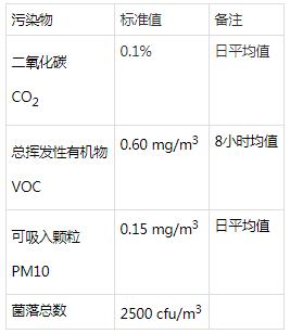 下表为中华人民共和国标准《GBT18883-2002 室内空气质量标准》对室内空气所设定的标准值: